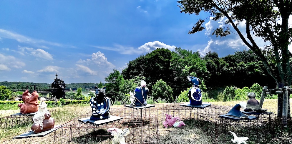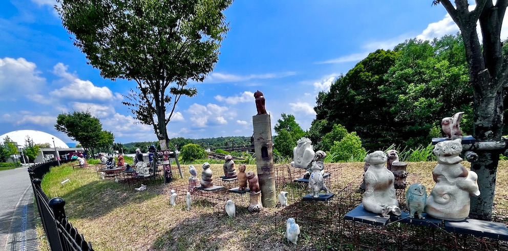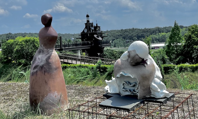 ジブリパークのエレベーター塔の手前、愛・地球博記念館へ向かうスロープに置かれた陶器の作品群たち