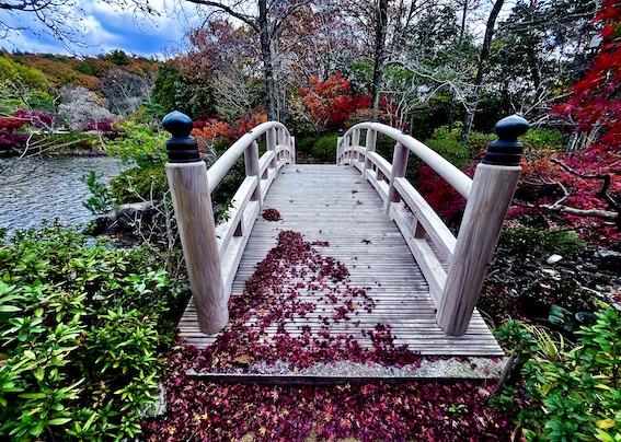 「日本庭園:南庭」は、石灯籠と3つの古橋がある伝統的な日本美を醸し出しています