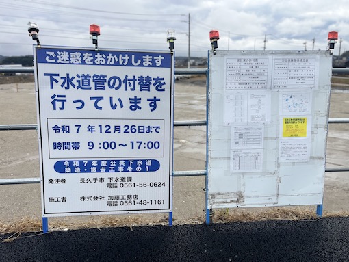 大草交差点から香流川を通過し福祉の家・長久手温泉ござらっせへ至る市道郷前大溝下1号線は、2026年3月まで全面通行止め