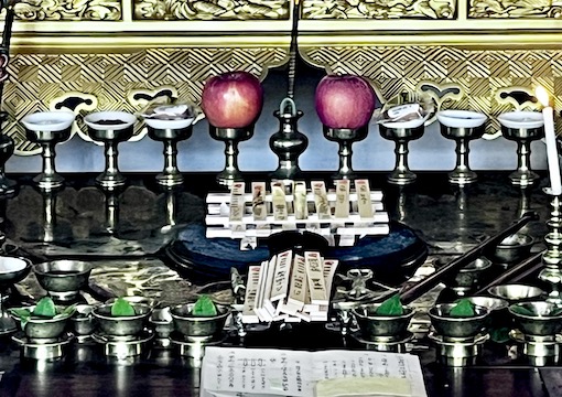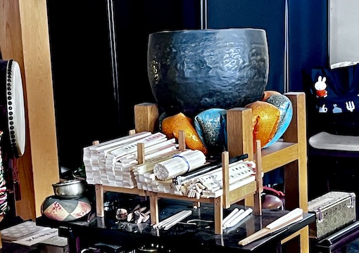 御本尊の前に設置された護摩壇。護摩木が準備され、祈祷に訪れた個人の願いを込めた「護摩札」や供物が準備されます