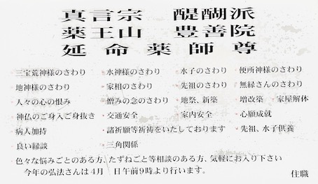 8日「薬師尊御縁日」/21日「弘法大師御影供」/28日「不動明王護摩祈祷」
