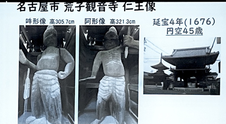 円空は長久手村の前熊寺にて韋駄天立像をつくった同じ年(推定)、名古屋中川区にある「荒子観音寺」に行き、なんと円空仏では例外中の例外、檜の大木を彫ってなんと3メートルを超える巨大な仁王像をつくっています。さすがに腕は円空仏では例外的に一木つくりではなく別に彫って取り付けています