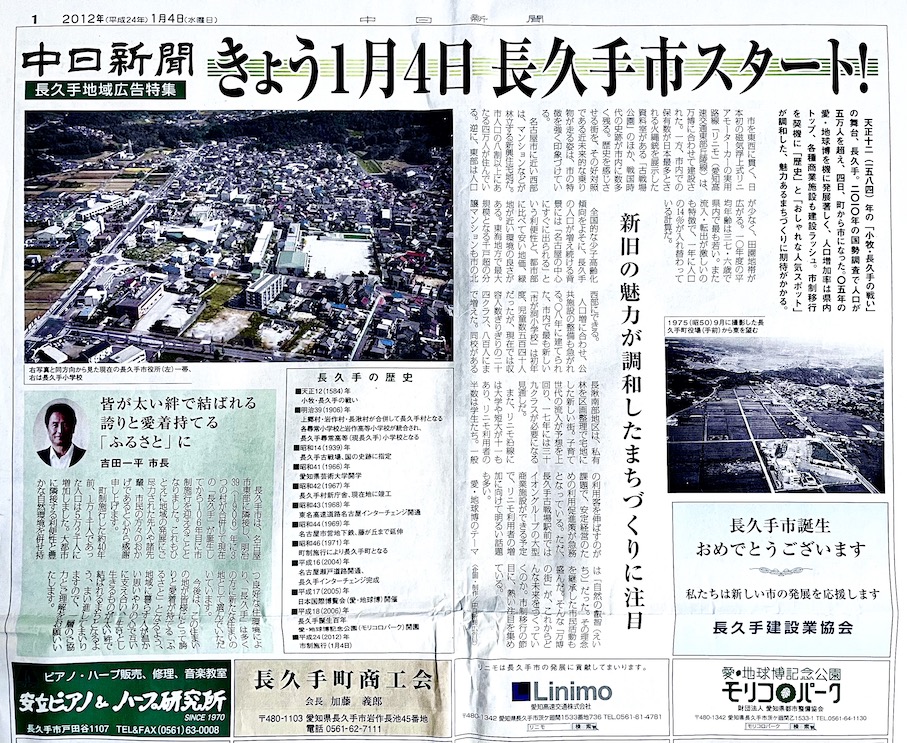「中日新聞」が、【祝 長久手市スタート】として本紙とは別の、”別刷で地域特集していましたので、どんな様子だったか紹介したいと思います。市長は吉田一平市長でしたね